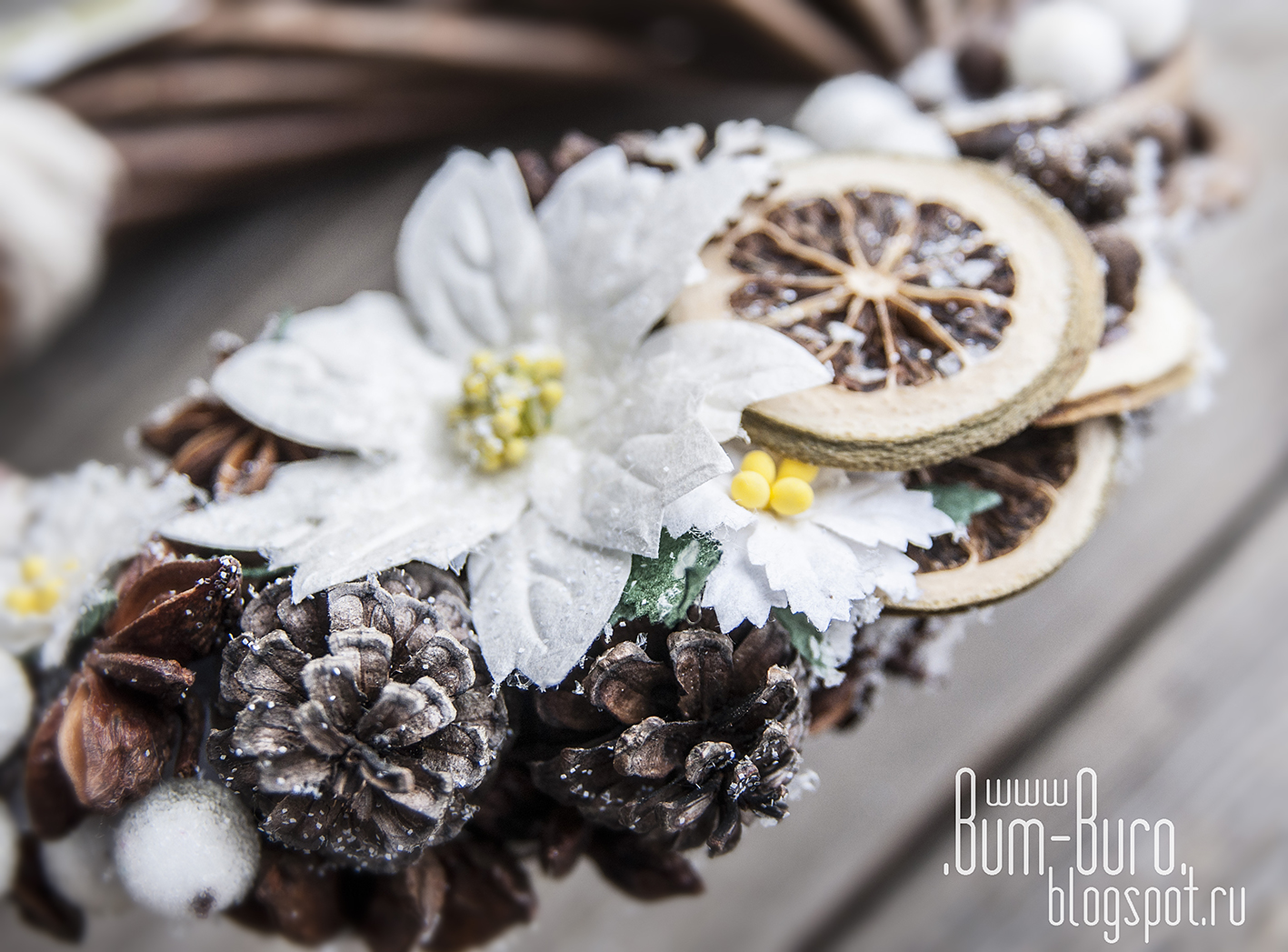 Я решила сделать новогодний венок. Что ещё так создаст уют и ощущение домашнего семейного праздника? У меня он получился очень сдержанным, почти черно-белым. Из ненатурального здесь только блёстки и тычинки на цветах. Кроме массы других достоинств эко-стиль ещё и очень бюджетный.